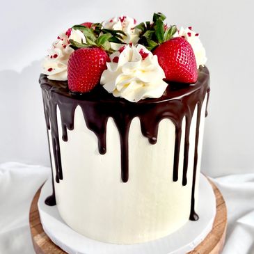 Choice of Vanilla or Chocolate cake filled with strawberry swiss meringue, topped with a chocolate drip & fresh strawberries.