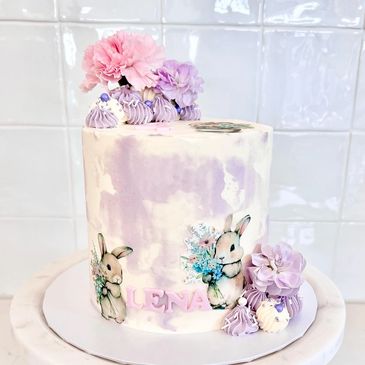 Adorable bunny themed cake is perfect for a birthday or baby shower.